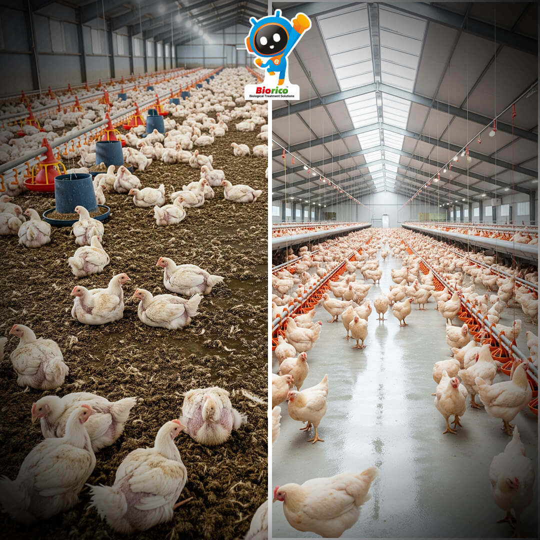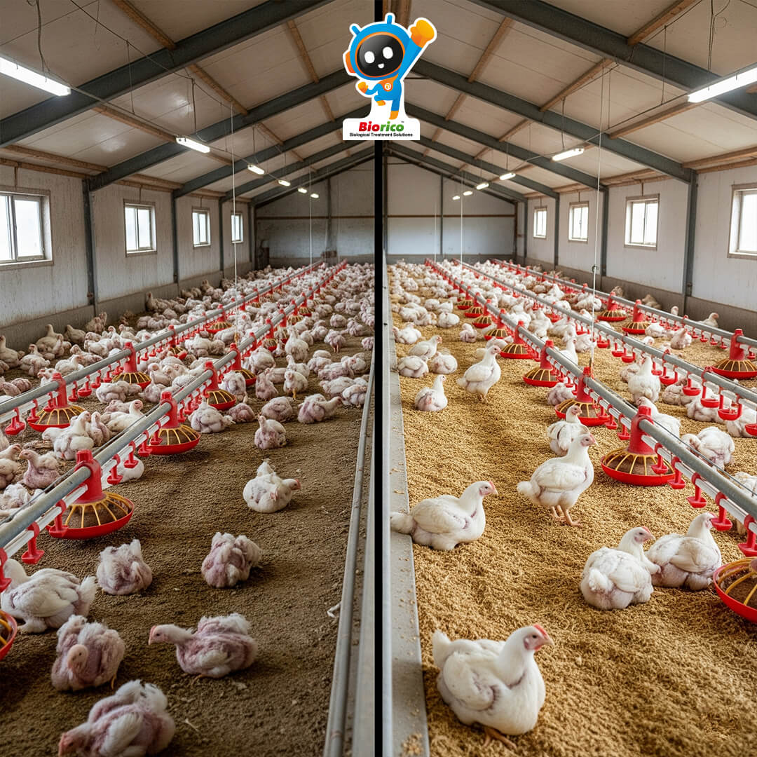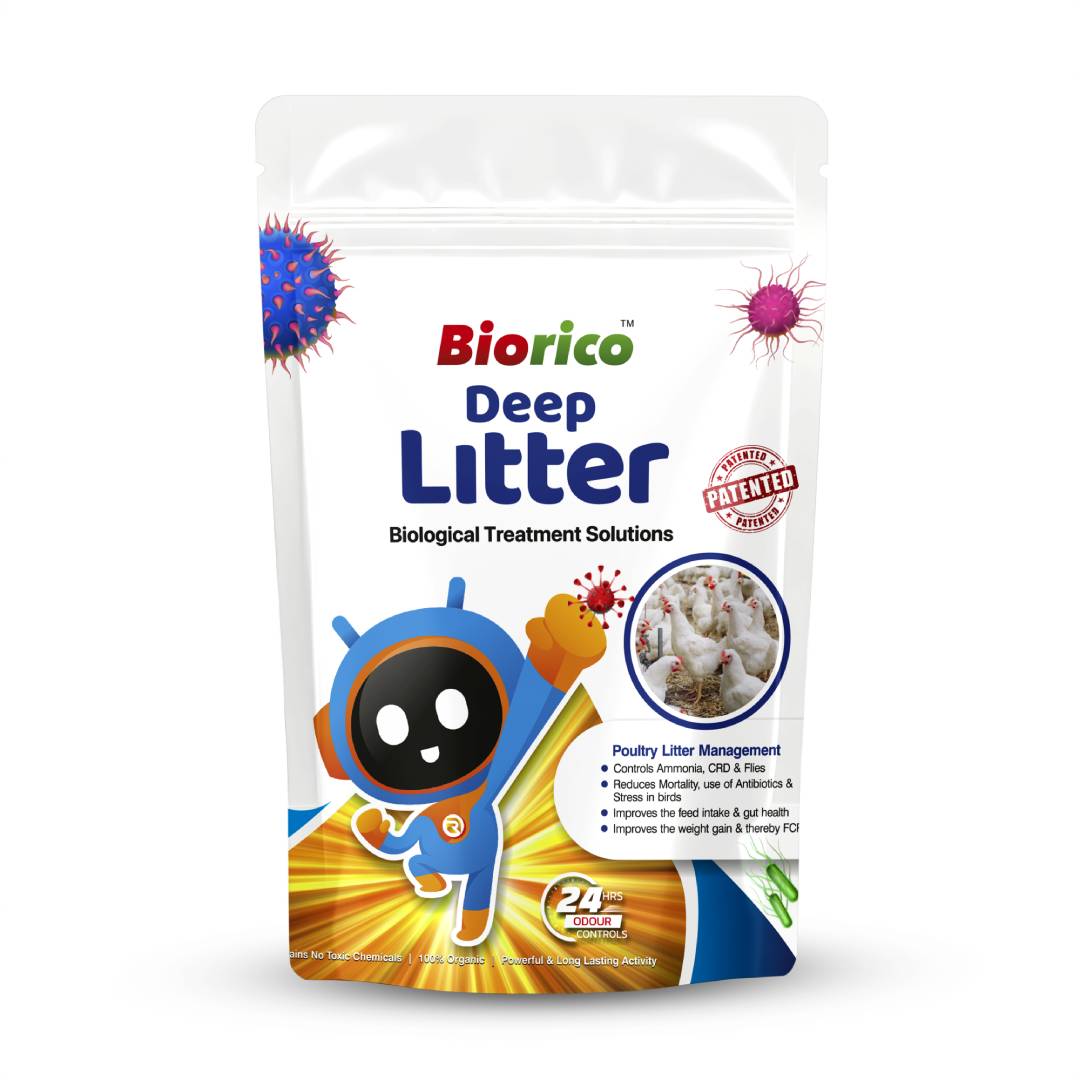 Biorico Poultry Deep Litter Treatment is a biological solution designed to maintain hygiene in poultry deep litter systems by eliminating ammonia odour, reducing pathogen load, and managing litter moisture. It improves bird health, reduces mortality, and enhances farm productivity in a safe and eco-friendly way.